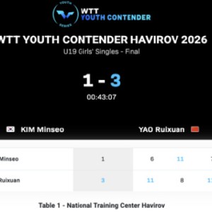 北京时间3月12日,WTT青少年常规挑战赛哈维若夫站丨U19女单决赛,姚睿轩3-1击败金珉舒夺冠,四局比分:【11-6,...