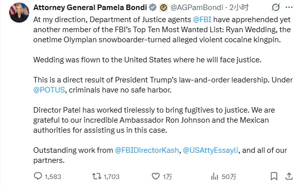 司法部长帕姆·邦迪(Pam Bondi)也在X上发文感谢帕特尔局长的不懈努力。她表示:“帕特尔局长为将逃犯绳之以法付出了巨大贡献。我们非常感谢罗恩·约翰逊(Ron Johnson)大使和墨西哥当局的协助。”
